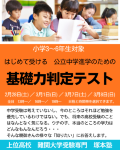 堀川・西京・嵯峨野や桃山自然科学・城南菱創・南陽などを目指す方のために、上位校の受験に臨むための基礎学力を判定するテストがあります。 答案・成績表の返却時には、成績データの見方、内容に関する所見、今後の勉強についてなどア […]