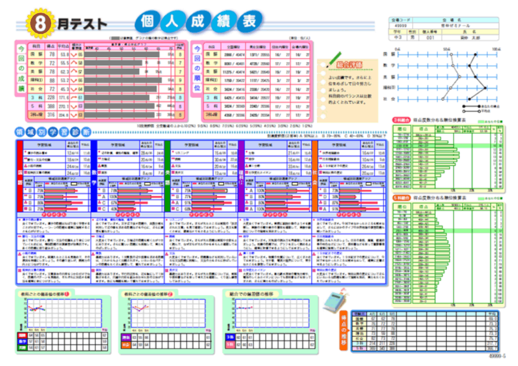 科目ごとの点数、平均点、順位、偏差値が出ます。また、科目の中の単元ごとの状況や、1問ごとの全体正答率も出ます。