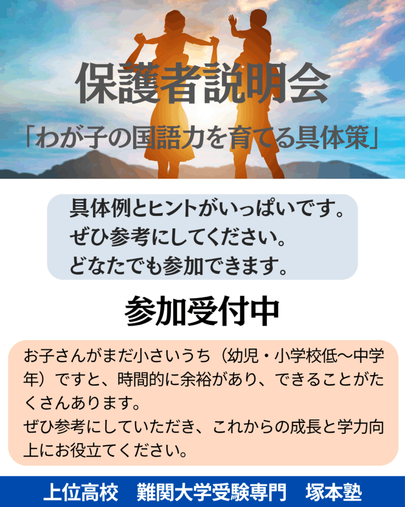 塾生の80%以上が堀川・西京・桃山・城南菱創以上に合格する、上位校受験専門塚本塾がお送りする保護者説明会 「わが子の国語力を育てる具体策」
