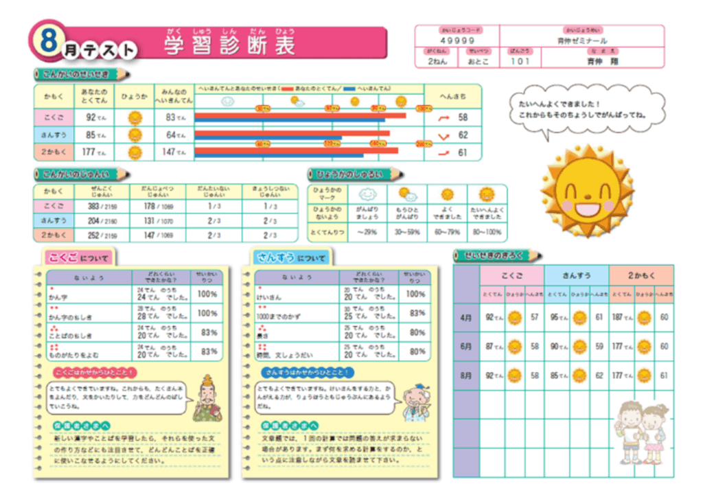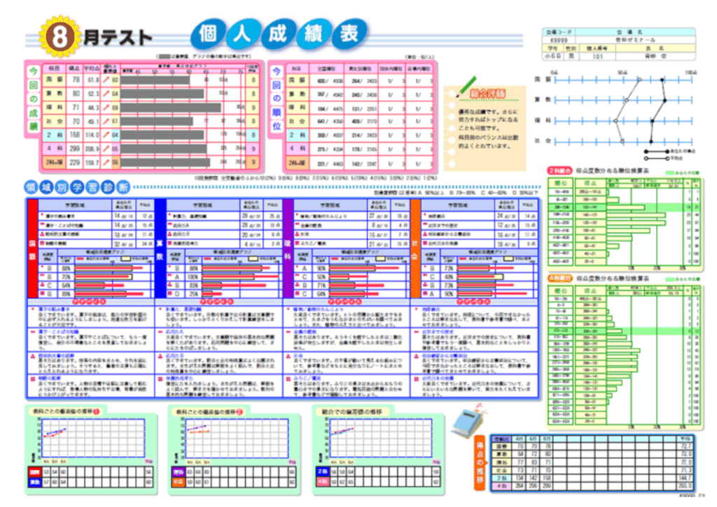科目ごとの点数、平均点、順位、偏差値が出ます。また、科目の中の単元ごとの状況や、1問ごとの全体正答率も出ます。